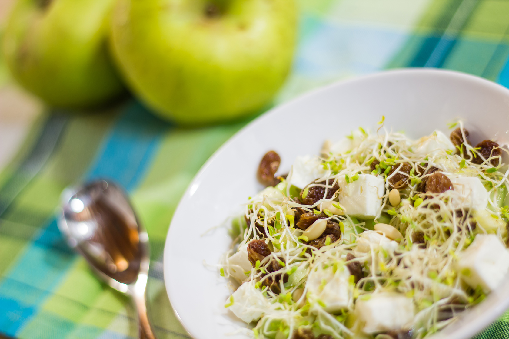 In a bowl add the pieces of feta cheese, raisins, pine nuts, apple, cucumber and sprouts. Prepare the sauce with the ingredients of the dressing and pour it flush over the salad.