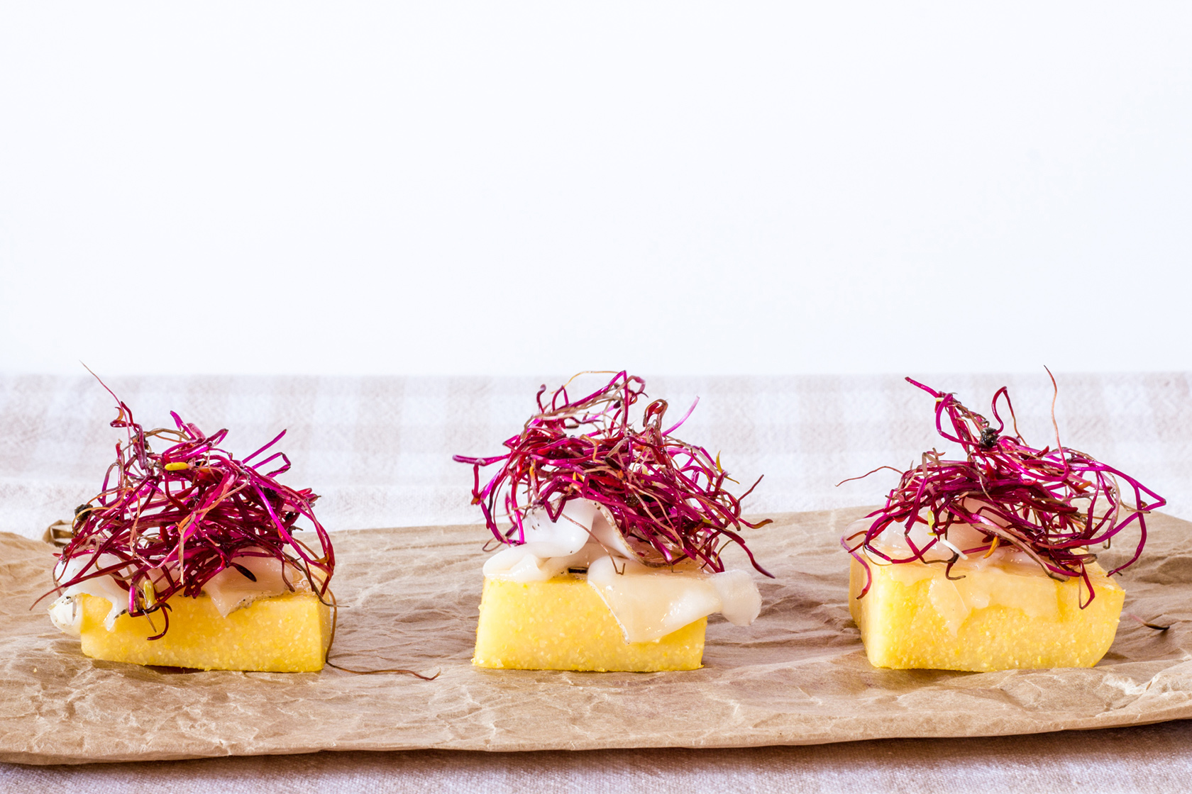 Cut the polenta into squares 5 cm high and 2,5 cm high. Preheat the oven to 180 °. Butter a baking sheet, place the polenta squares on top and put them in the oven for 5 minutes. Cover the polenta croutons with the slices of lard. Give the lard a few minutes to melt a little and become soft, then sprinkle each crust with a handful of beetroot sprouts. Serve hot.