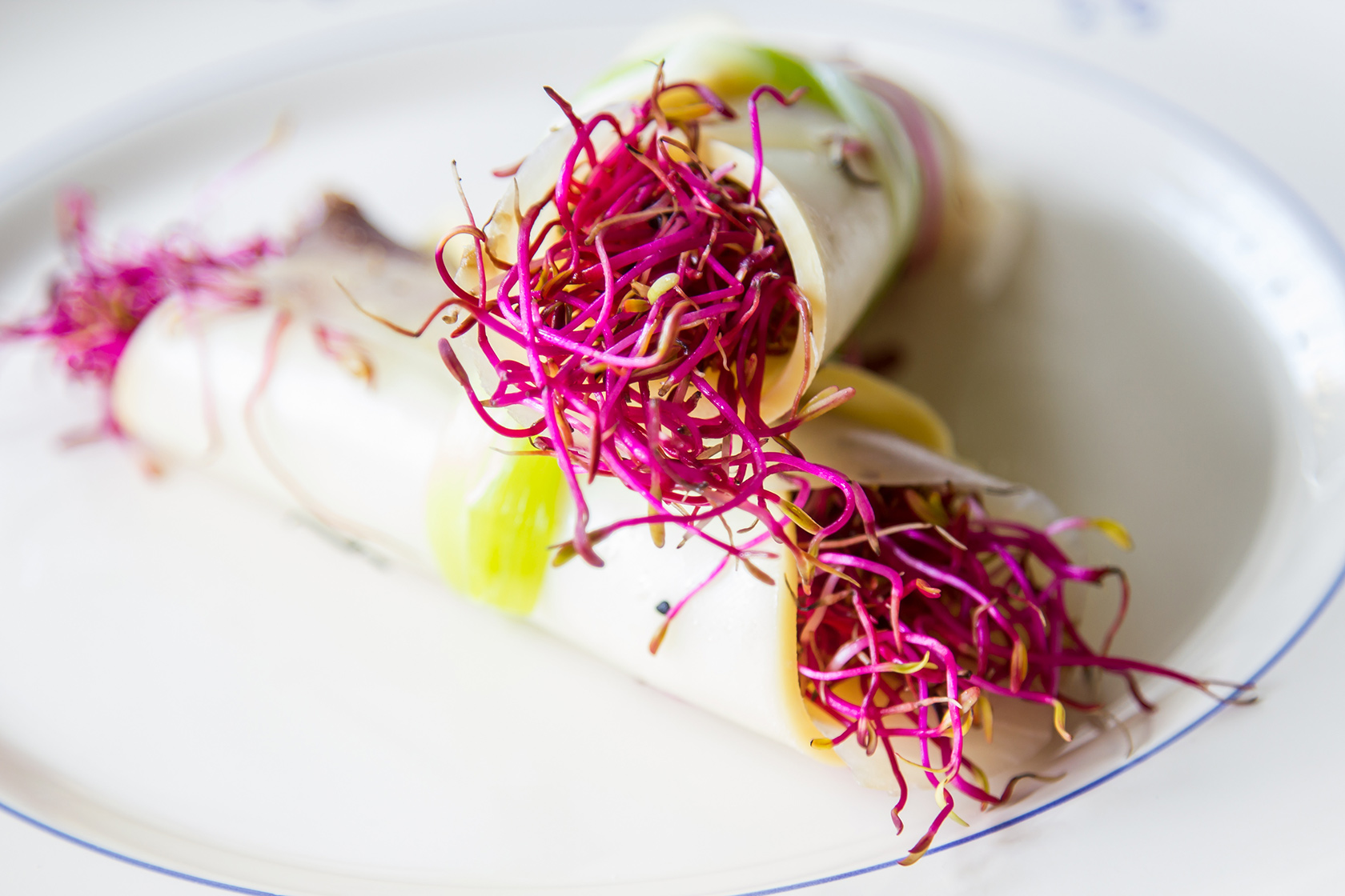 Slice the scamorza cheese and place the swordfish on top of each slice, season with a drizzle of oil and season with salt and pepper. Roll up gently and before wrapping completely add the sprouts. Close with a knot of chives.