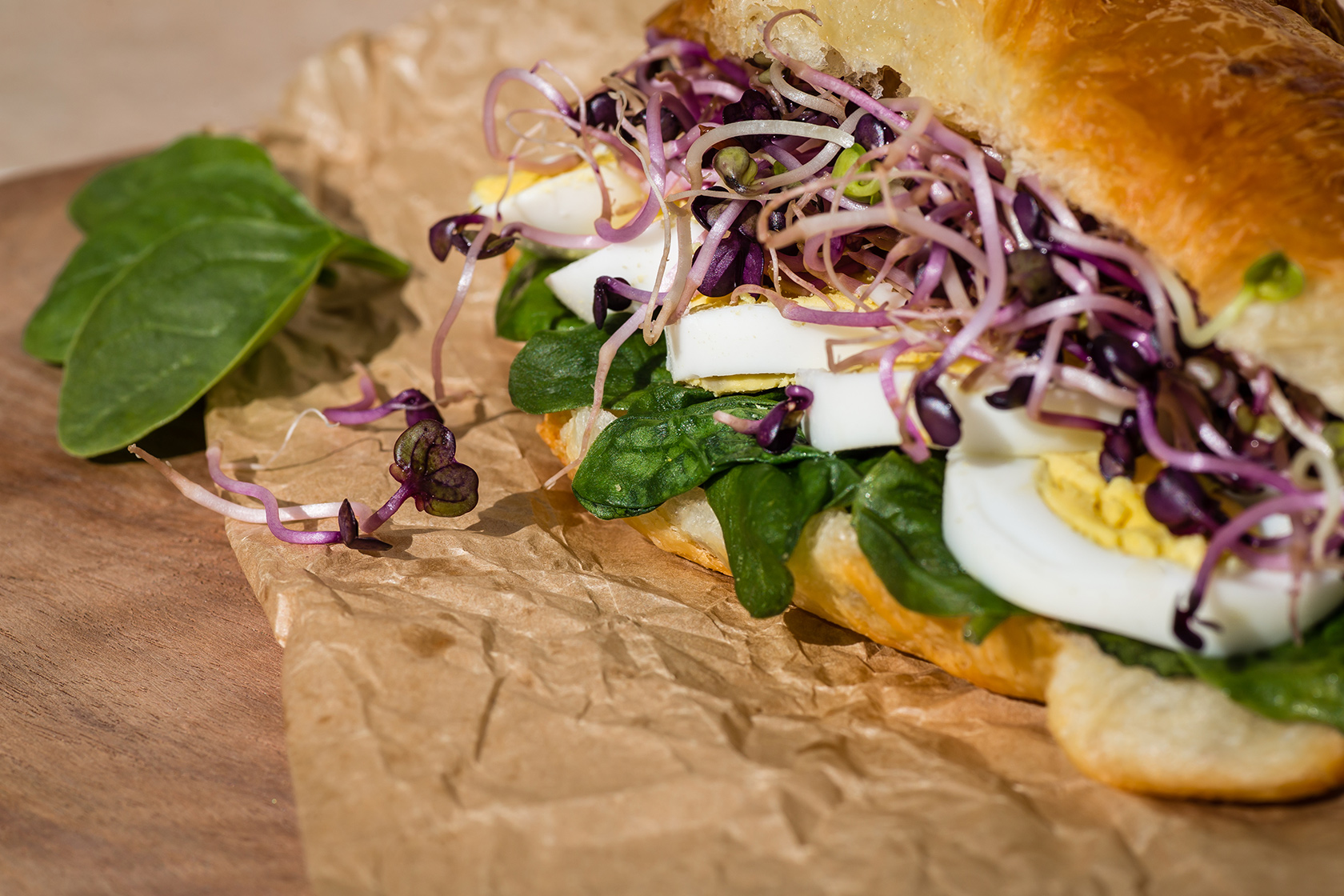 In una padella rosolate lo spinacino con olio d’oliva, sale e pepe a piacere. Prendete le uova sode (cotte in precedenza) e tagliatele a fettine. Tagliate le brioches “a tasca” e farcitele con lo spinacino, le uova e guarnite con i germogli.