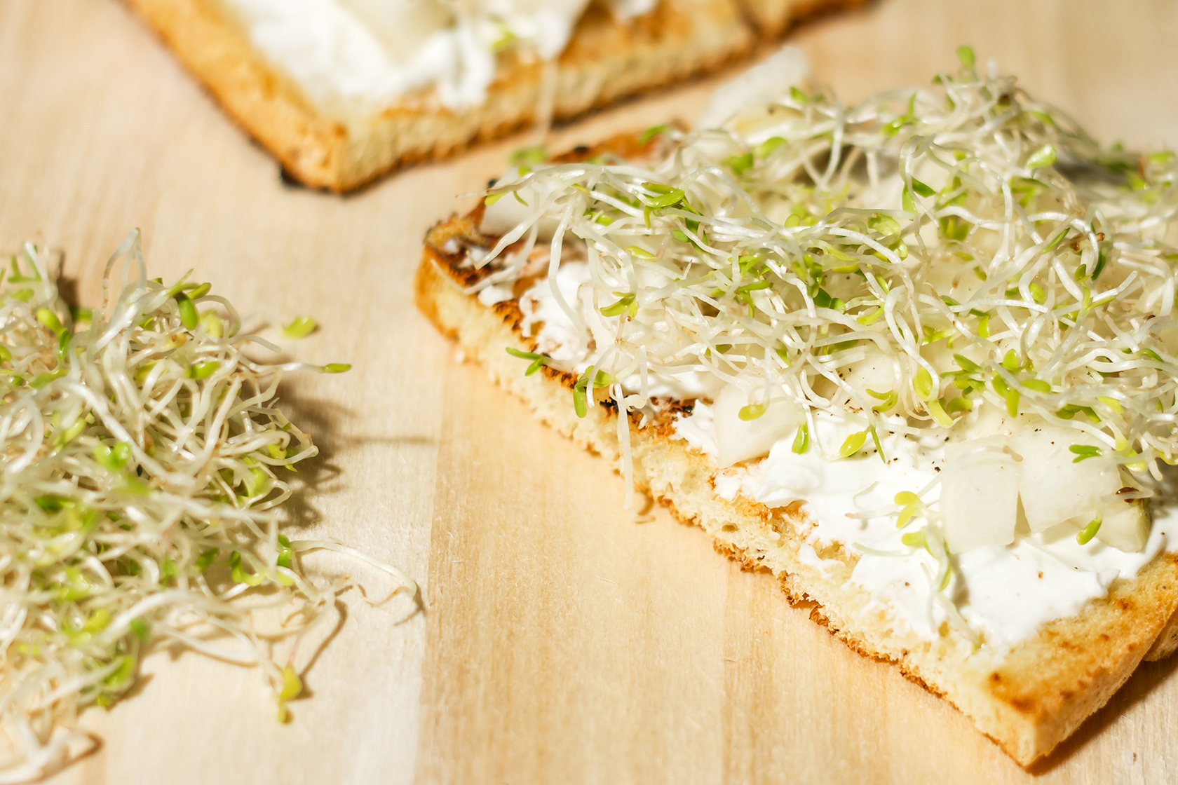 Fate abbrustolire le fette di pane casereccio e mettete da parte. Lavorate con una forchetta il formaggio, preferibilmente caprino, con un pizzico di pepe, un cucchiaio di olio e qualche filo di germogli alfa-alfa. Sbucciate la mela, il cetriolo e tagliateli a cubetti. Condite con sale, pepe e olio extravergine di oliva. Spalmate le bruschette con la crema di formaggio e guarnite con il composto di mela, cetriolo ed i restanti germogli alfa-alfa.