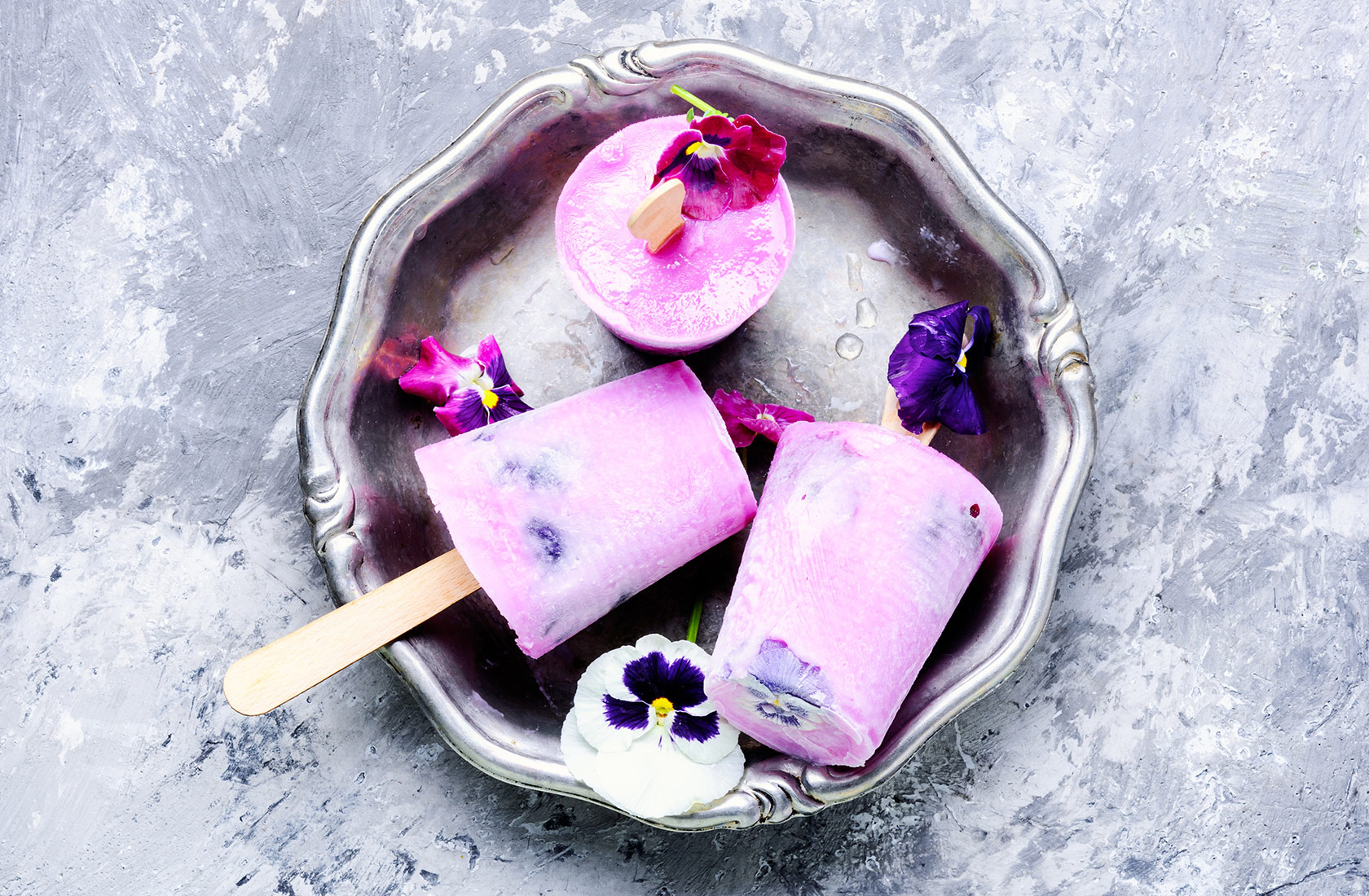 Con l’aiuto di un robot da cucina frulla la frutta, lo yogurt e il miele fino ad ottenere un composto cremoso. Aggiungi i fiori edibili. Trasferisci in 6 coppette (vanno benissimo anche dei bicchieri di plastica) e per ognuna infila al centro uno stecchino da gelato. Riponi in freezer fino a quando non sarà ben congelato. Al momento di servire scalda tra le mani il bicchierino, capovolgi e il gioco è fatto!