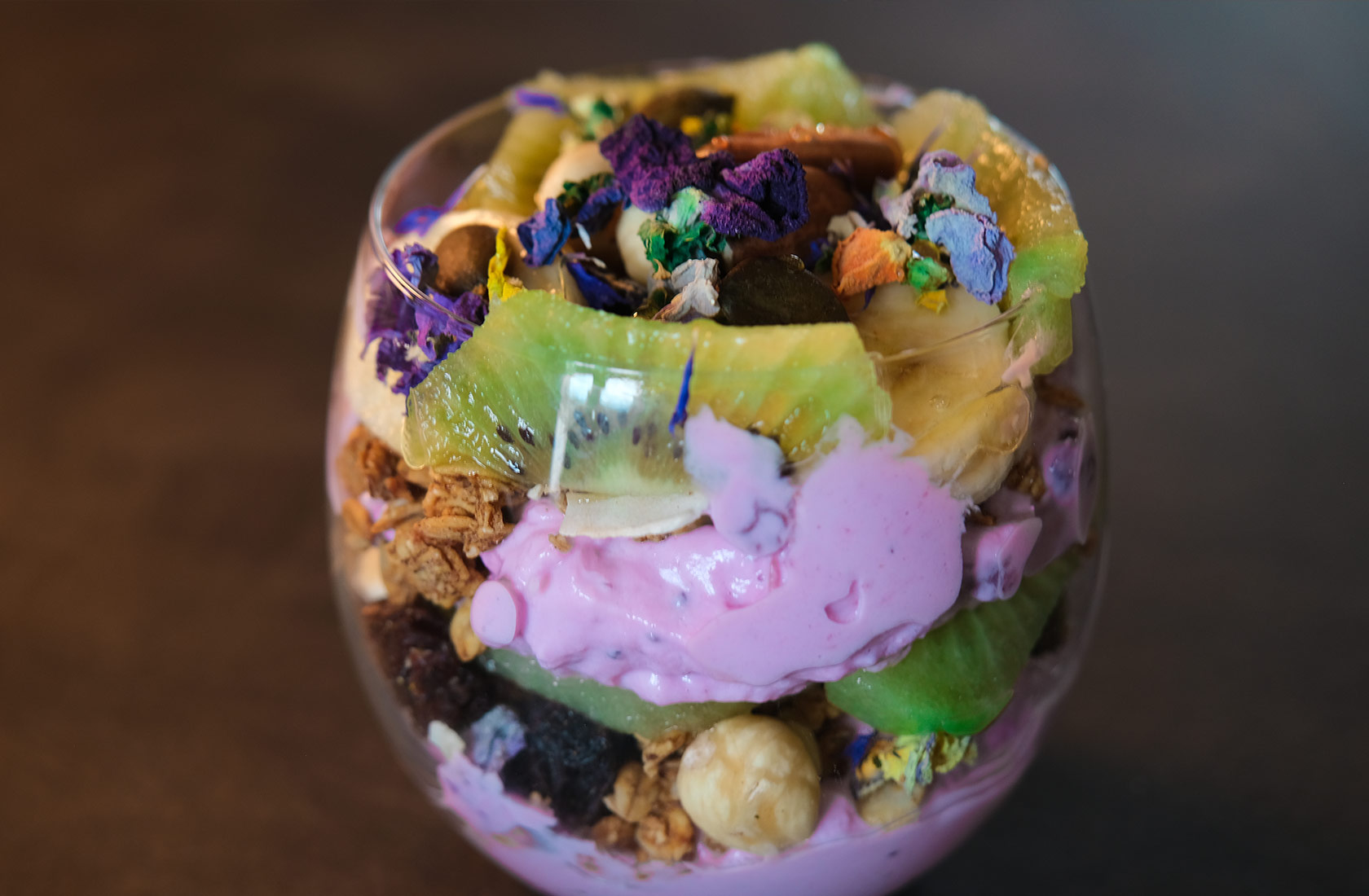 Tagliare la frutta sottilmente. In un bicchiere stratificare yogurt, granola, frutta, snack merenda fino a riempire il bicchiere. Aggiungere il miele per la nota dolce.