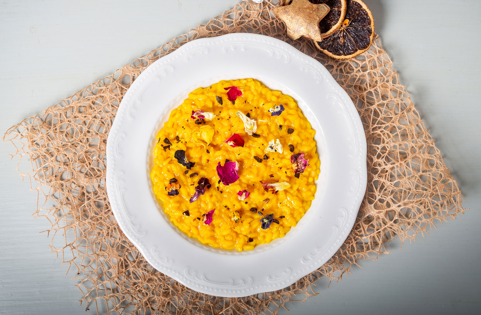 Preparare il fondo di risotto con scalogno e olio evo, far cucinare i cubetti di zucca, aggiungere di volta in volta dell’acqua. Quando la zucca è pronta toglierla e frullarla per creare una crema. Nello stesso fondo far tostare il risotto e portarlo a cottura aggiungendo sale e pepe e qualche chicco di caffè tostato e tritato. Quasi a fine cottura aggiungere la crema di zucca, e mantecare con burro e formaggio grana. Servire con alcuni chicchi di caffè tostato e fiori disidratati.